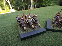 I've been saying I'm finished with my Carthaginian army for about six months now. I guess this is one of those armies that will never be completely finished. In this case I can say with reasonable certainty that these are the last veteran hoplites that I'll be painting for the army. These figures, are converted from Roman triarii figures from the Old Glory Republican Roman line. I've snipped off the plumes and of course painted the shields appropriately. The white unit has a combination of homemade decals I had left over and hand-painted shields. The red shields are left plain to match the rest of the units in the red wing. This brings each of my veteran hoplite wings up to the full strength of four stands.