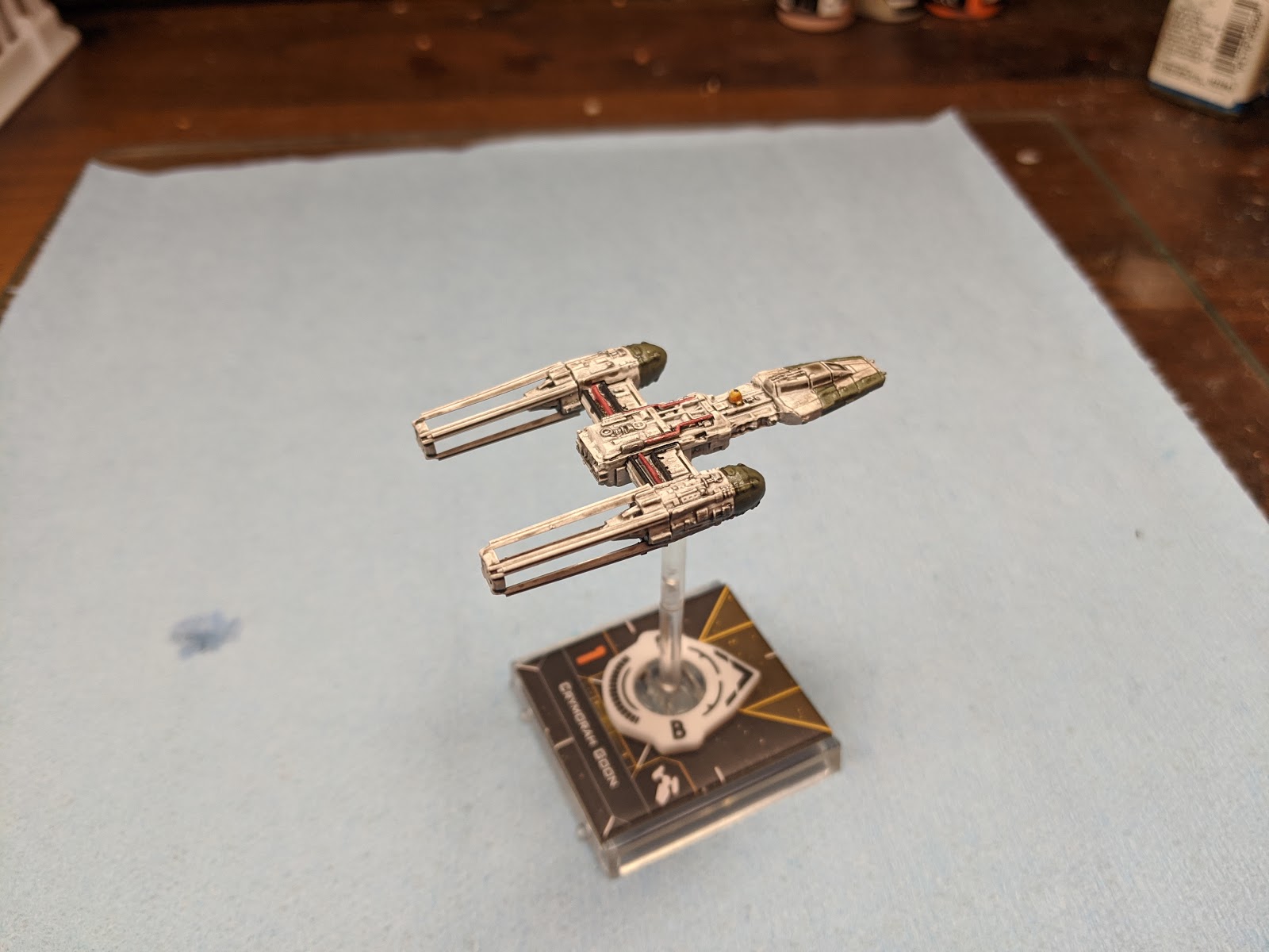 This was a quickie painted at the end of my stream tonight. I'm a big fan of Kavil as a scum Y-wing pilot. They've raised the points for the veteran turret gunner crew, but on Kavil, I think it might still be worth the points. I fly Kavil enough that he deserved his own painted ship. The card art for him is pretty atrocious. I've seen a few Kavil re-paints in dark green schemes that I liked, so I went with a variant of that for mine.